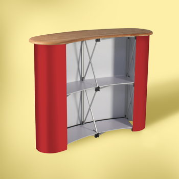 Description : comptoir démontable impression couleur rectangle courbé ou rond. Fourni au choix avec ou sans structure & sac de transport.