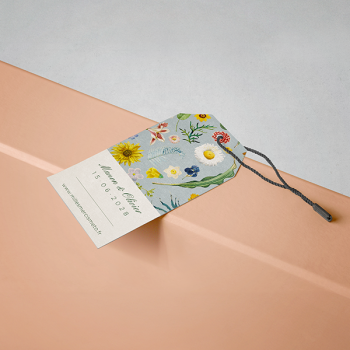 Tags printing + perforation or custom die-cut on many sturdy papers from 100 units only. Optional custom finishes as well as multi-designs.