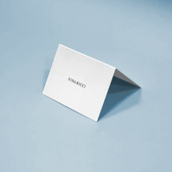 Name tag small format with a crease in the center on several papers available (coated, recycled, textured, coloured). White or metallic inks on coloured papers available.
