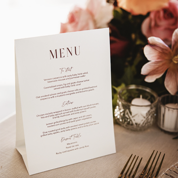 The menu is a crucial part of your dining experience, and we offer beautifully printed menus that reflect your wedding’s style. Whether you’re serving a multi-course meal or a buffet, our menus add a touch of sophistication to your dining arrangements.