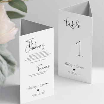 Printing of table displays on paper (simple or to be glued) or rigid board with easel, or on PVC with thermo-folding.