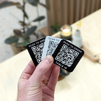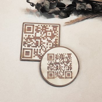 Small rigid engraved QR codes on 2-coloured Trolase medium or on wood (upon stock) with custom size and shape.