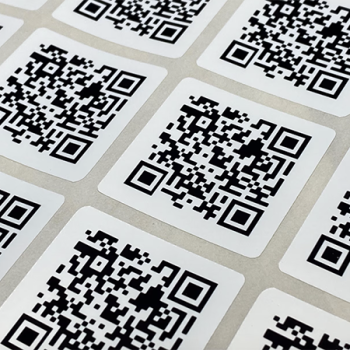 QR adhesive stickers printed on various media such as white or clear vinyle with standard or custom shapes available.