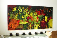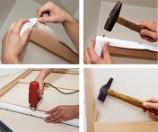 - Elle est tout d’abord agrafée manuellement au châssis bois à l’aide d’agrafeuses puissantes. Le repérage du centrage est donc fait à l’œil.