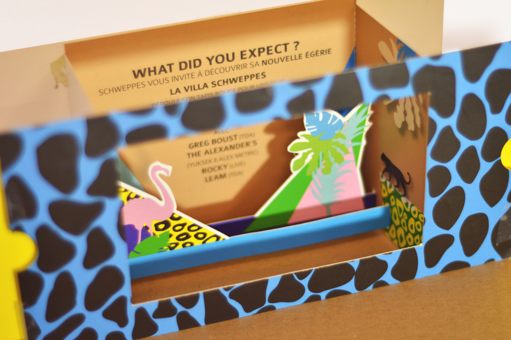 Exemples d'assemblages après découpe : 10.000 masques Roland Garros à l'effigie de Gaël Montfils (pose manuelle d'élastiques après découpe), 400 invitations ouverture en 3D pour la Villa Schweppes avec assemblage et collage complexes, découpe de 700 pochettes spéciales, collage des rabats et insertion manuelle de cartes postales dans cette pochette, mise sous enveloppe avec publipostage etc.