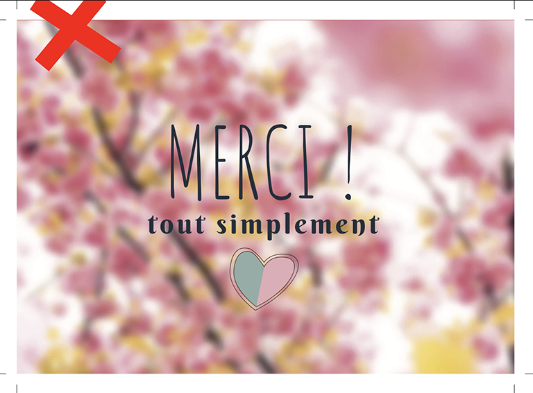 6 / Vérifier le rendu du PDF exporté : il est important que vos traits de coupe coupent dans la masse de la couleur et non au bord du document. Voir les images de la galerie ci-dessus. NB : sur fond blanc, ceci n'a pas pas d'importance. Archivez votre travail sur le logiciel. Chargez votre / vos fichier(s) dans le formulaire de commande. Ils seront ensuite revérifiés par nos graphistes.